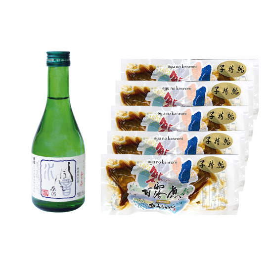 みなとや自慢の「子持鮎甘露煮」5尾と「しぼりたて原酒 水音 300ml」1本をセットにいたしました。