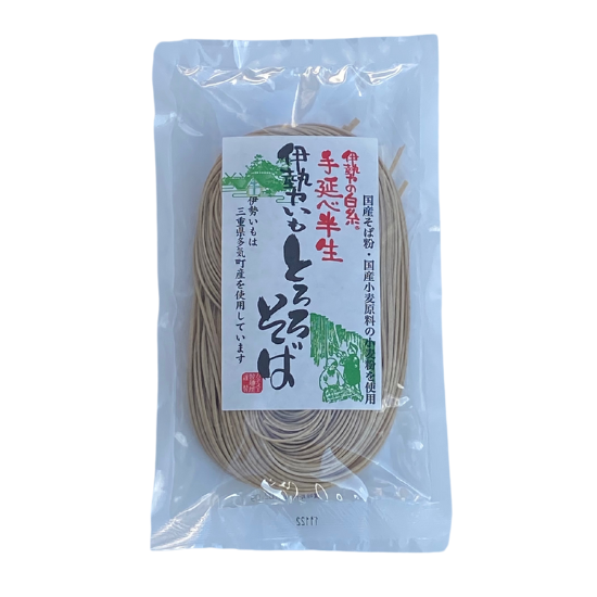 多気町原産の「伊勢いも」を麺に練りこみました。普通のそばでは味わうことのできないコシと風味が特徴です。年越しそばにもピッタリ!是非お楽しみください。